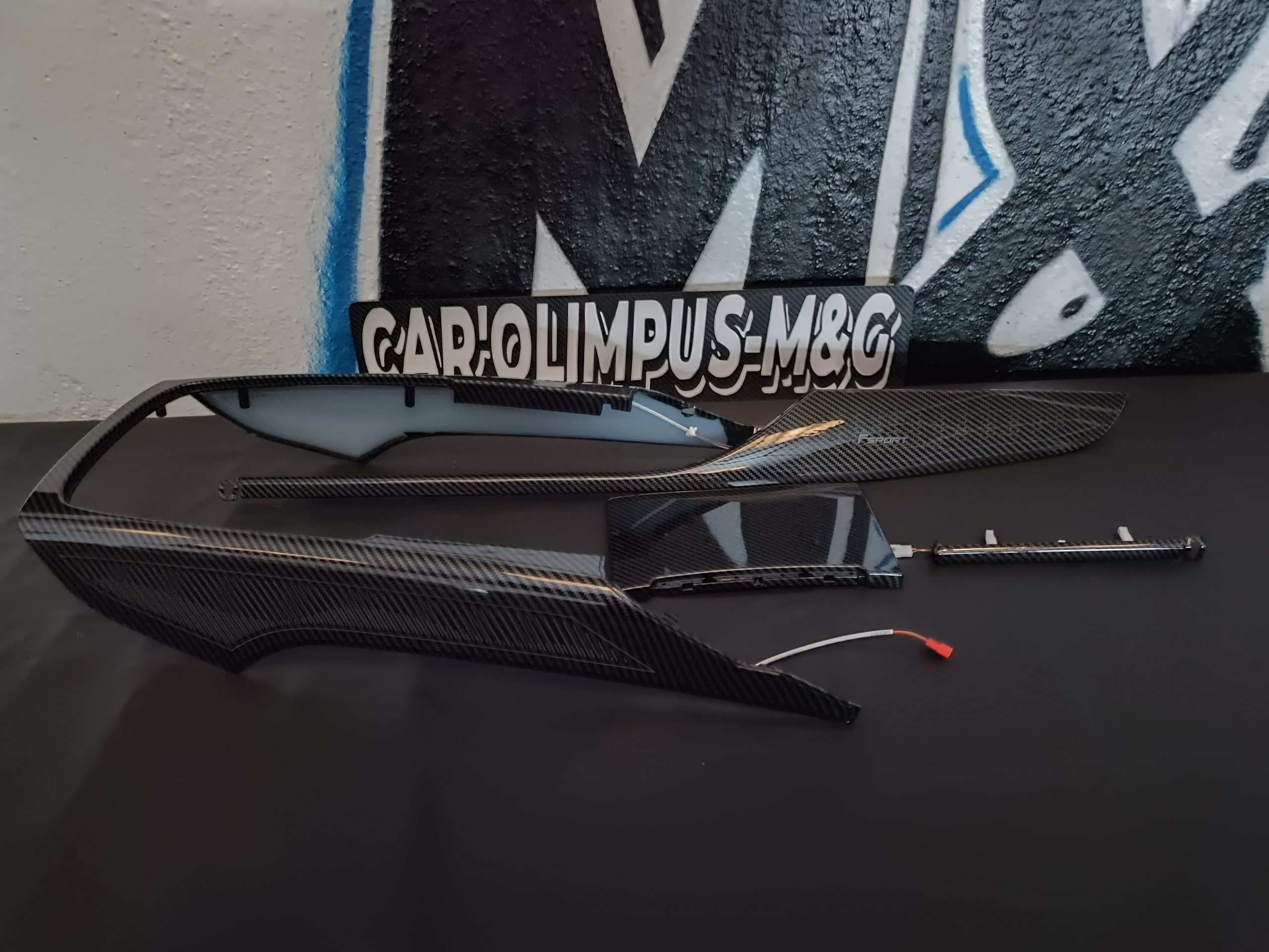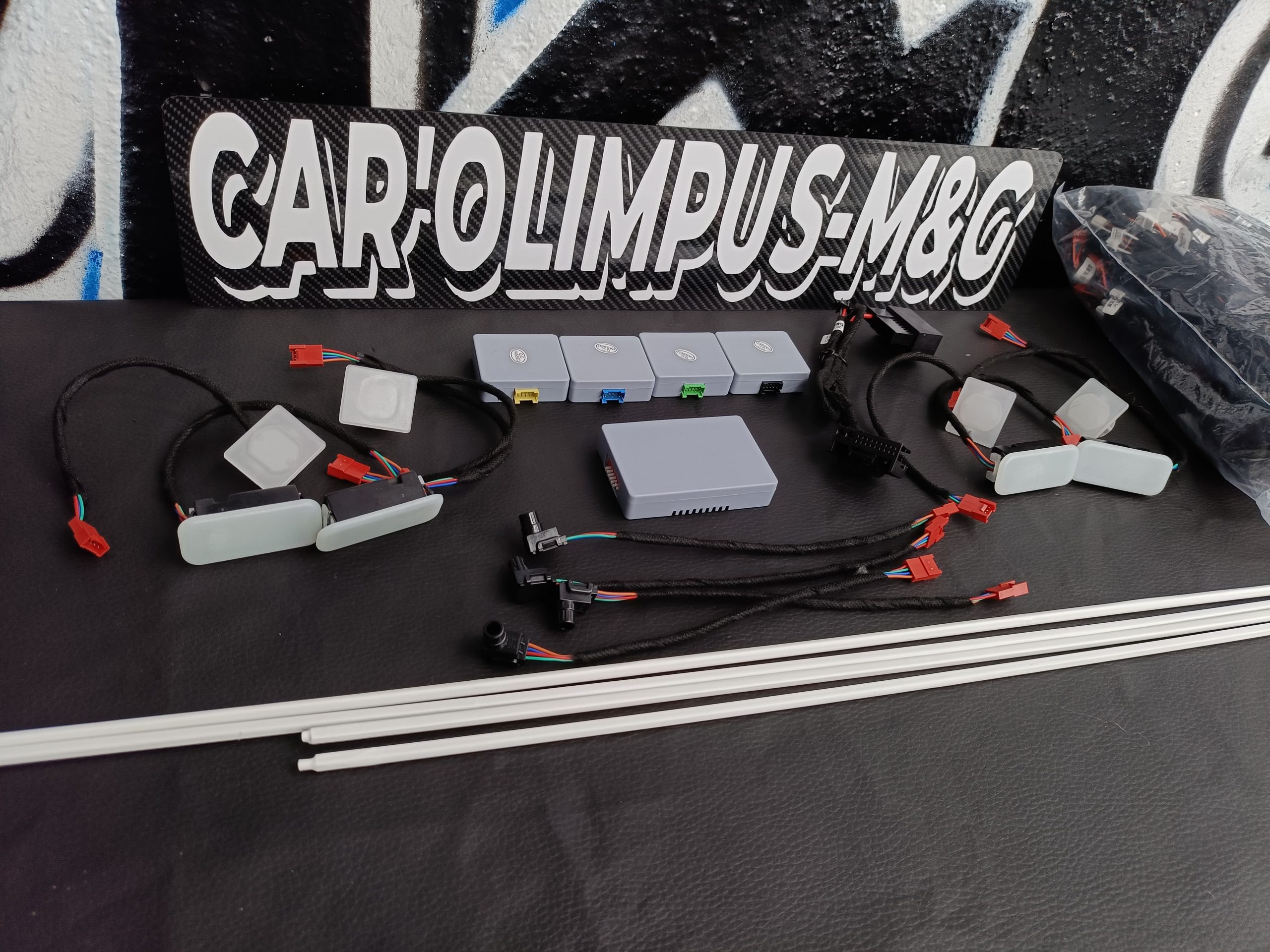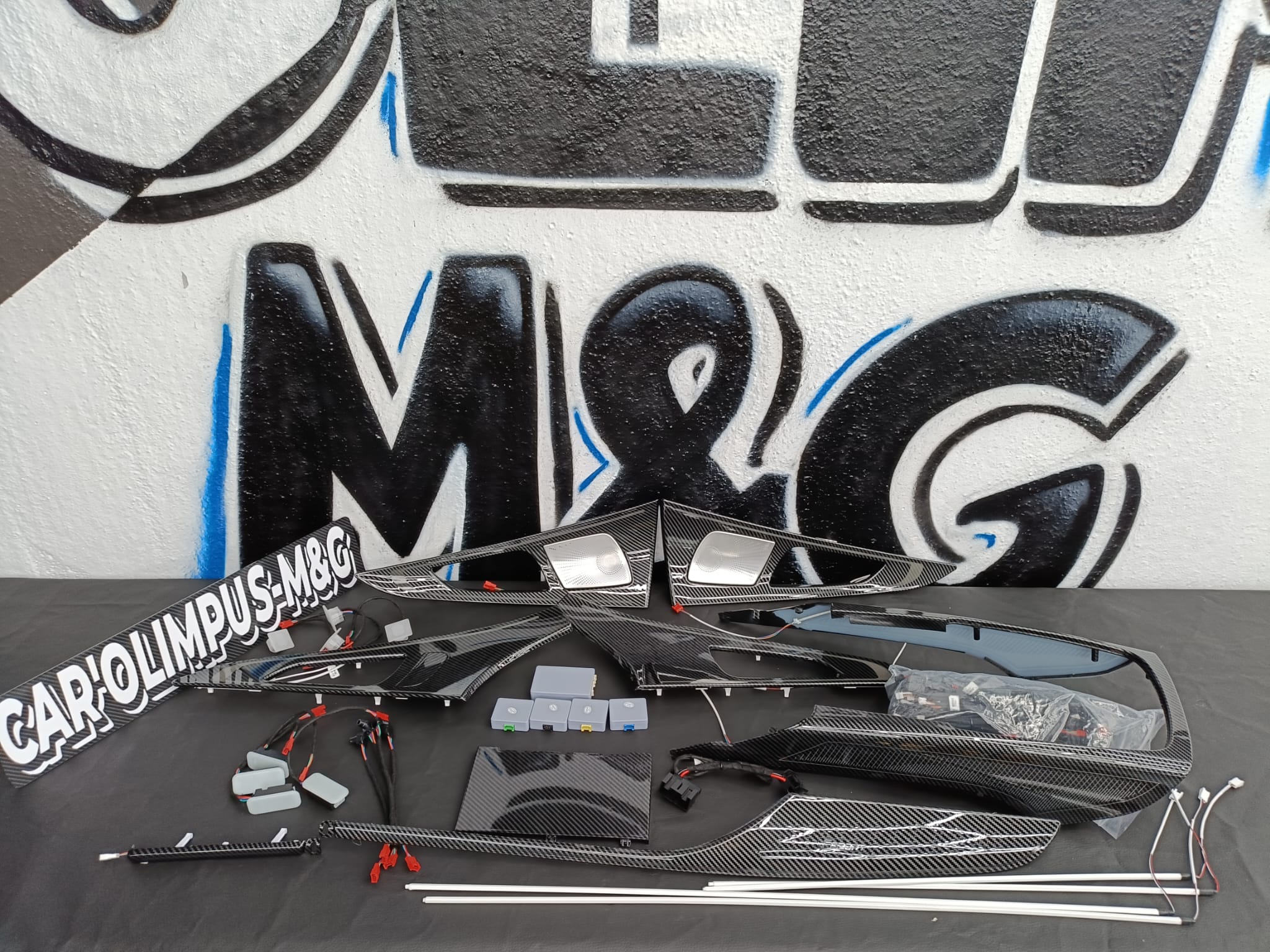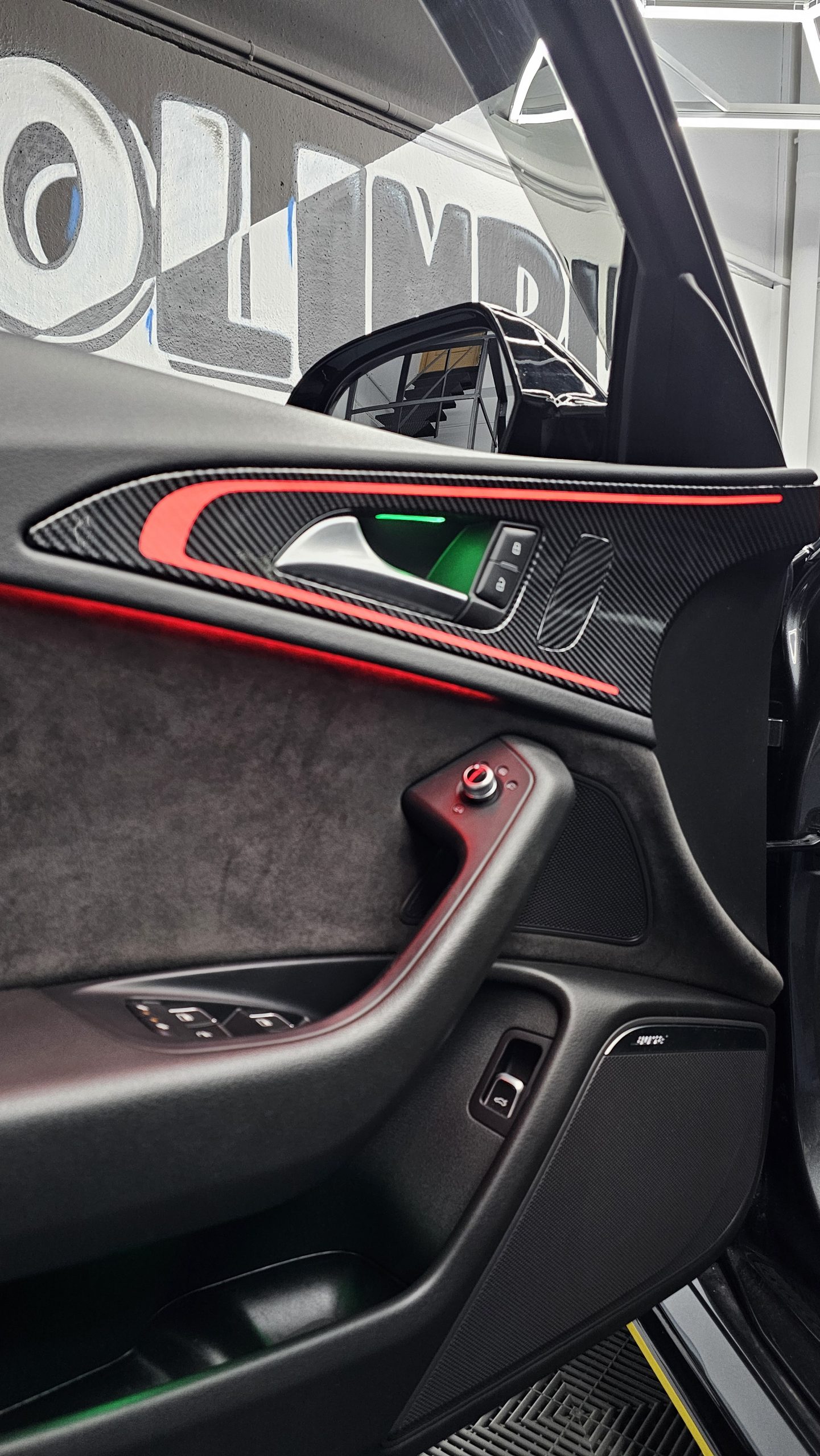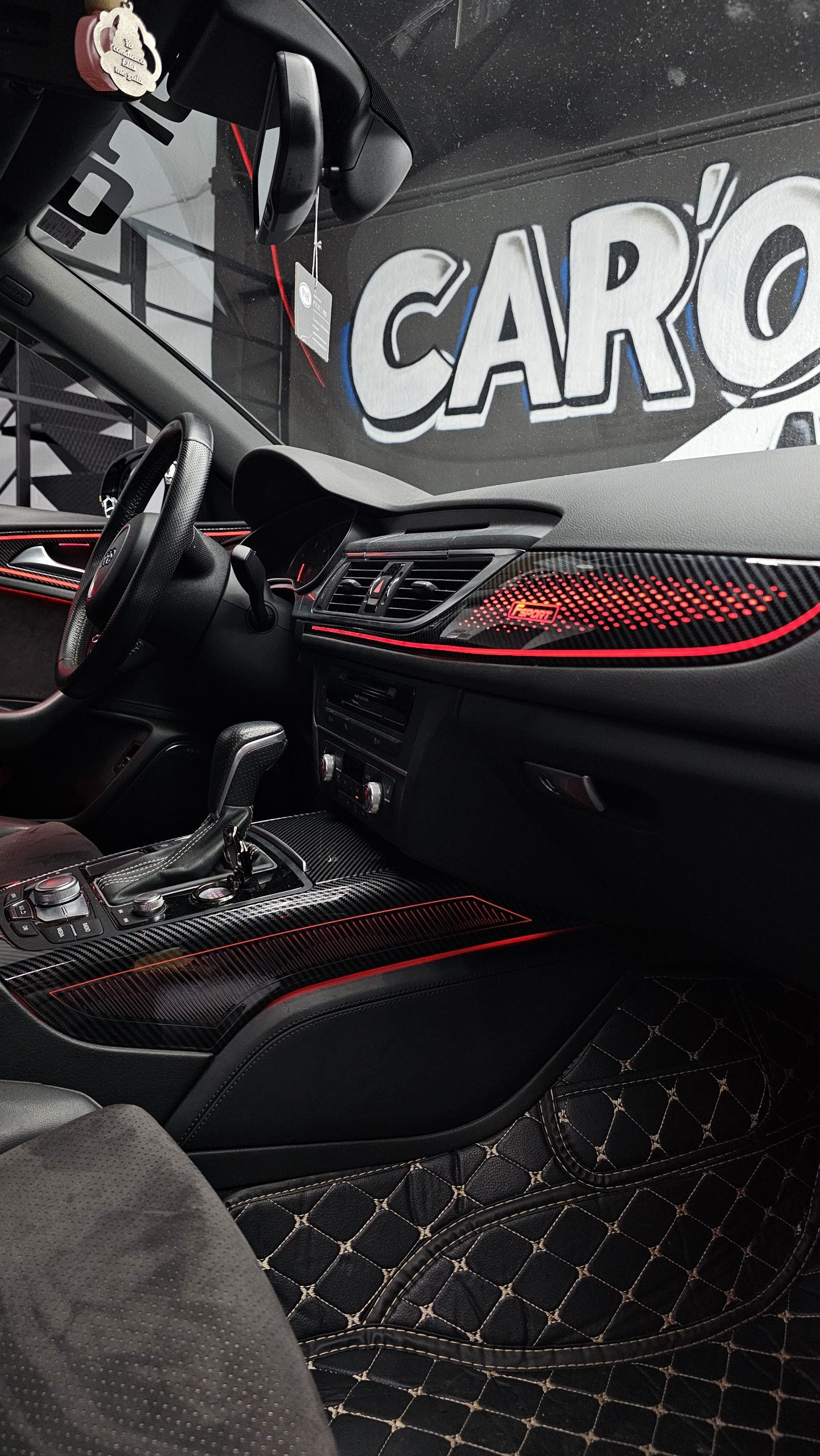 KIT DE ILUMINACIÓN ESPECÍFICO PARA AUDI A6 C7, CON EMBELLECEDORES, ESTILO CARBONO INCLUYE 4 TIRAS LED PARA LAS PUERTAS, 4 LED PARA MANILLAS, 4 LED PARA CAJONERAS, CONCOLA CENTRAL I SALPICADERO,.